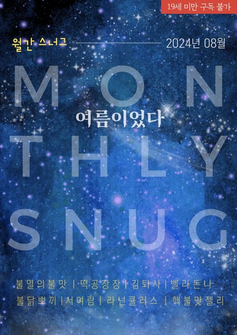 한여름의 해후 불멸의불맛 고등학생 때 죽은 줄 알았던 녀석을 제주도 여행에서 마주쳤다. 교복을 입은 채 바닷가 바위 위에 앉아 있던 녀석, 서도율. 하지만, 우린 이미 성인인데? 귀신인가? 녀석은 제대로 인사 나눌 틈도 없이 밤에 펜션 주차장에서 만나자는 말만 던져 놓고 촬영팀 속으로 사라져 버렸다. 그리고. “네가 서도율 첫사랑이라는 거. 그래서, 네가 몹시 보고 싶었다는 거. 그리고, 지금…… 네가 퍽 예쁘다는 거. 키스해도 돼?” 모두가 야간 촬영을 떠난 텅빈 펜션. 지윤은 서도율에게 한 톨도 남김 없이 속속들이 발라먹히고 마는데. 그리고, 마침내 밝혀진 녀석의 정체. 녀석은 바로······. 너를 그리다가 떡공장장 더 이상 여기 있을 이유가 없다고 판단한 최이준이 자리에서 조용히 일어섰다. 그 모습을 보자마자 한서연의 눈이 동그랗게 커졌다. 여기서 놓치면 다음은 기약 없었다. 다급한 마음으로 최이준을 붙잡았다. 그가 입은 하얀 셔츠 끝자락을 잡은 손끝이 절박하기만 했다. “나, 진짜 예술을 하고 싶어요.” 열대성 저기압 김퇴사 태풍으로 비바람이 몰아치는 어느 여름날, 학교 도서관에 왔던 이경은 우산을 잃어버리게 된다. 난감해하는 이경의 앞에 황매화가 나타나는데.... *** “어깨가 많이 젖었네.” 어느새 황매화가 곁에 바짝 붙어서 이경의 어깨를 손으로 톡톡 건드렸다. 그에 아래를 향하던 눈이 반사적으로 위로 올라왔다. 그리고 마치 약속이라도 한 것처럼 황매화의 눈과 딱 마주치고 말았다. 얼마 동안의 정적이 흘렀다. 그러다가 마침내 황매화가 먼저 입을 열었다. “옷 말리고 갈래?” 이경은 천천히 고개를 끄덕였다. 엘리베이터에서 내리고, 현관문이 닫히는 소리가 들리자마자 이경은 곧장 황매화를 삼켰다. 여름 별장 근신령 벨라돈나 재벌집 손녀딸인 윤하의 인생은 지루하기 짝이 없다. 늘 새로운 자극을 쫓다가 결국 부모님에 의해 시골 별장 근신령에 처해진 윤하. 외롭고 지루한 여름을 보낼 생각에 부루퉁해있던 그녀의 눈에 별장에서 일하는 일꾼 남자가 들어온다. 그것도 더운 날씨에 상의를 벗은 채로 수영장을 청소하는 근육남이! “내숭 떨 것 없잖아. 어차피 눈빛 보면 다 아는데.” “처음부터 이게 목적이었어?” 뜨거운 여름에 걸맞는 자극에 윤하는 선을 넘고 만다. 이럴 생각은 없었는데 불닭뽀끼 쿵쾅거리는 심장이 강하게 내리치는 저 빗줄기보다도 더 큰 소리를 내는 듯했다. 점점 진혁의 얼굴이 하연에게로 다가왔다. 천천히 돌아간 고개에 하연도 맞춰 얼굴을 기울였다. 그의 입술은 생각보다 따뜻했으며, 부드러웠고 한 가닥 남아있던 하연의 이성을 끊게 하기에 충분했다. 아, 정말 이럴 생각은 없었는데. 이제는 정말 어떻게 할 수가 없었다. 그러므로 여름이었다 서여림 제주도에서 보냈던 중학교 시절의 2년은 해수에게 있어서 잊을 수 없는 기억이었다. 달달한 감식초도, 마당에서 멸치 대가리를 따던 것도... 그리고 그 애를 사랑하게 된 것도. 성인이 되고 다시 돌아온 제주도는 여전했다. 사랑스러운 사람들과 강아지들이 사는 동네였다. 모든 것이 완벽했다. 그 애, 권재준이 옆집에 있다는 사실을 알기 전까지는. *** 권재준은 사랑을 몰랐다. 그가 기억하는 사랑은 맵고 짜고 달고, 세상의 모든 조미료를 섞어놓은 것이었다. 자두밭 그늘 라넌큘러스 “반지가 다시 전학 왔다고?” “말도 안 돼.” “그렇게 떠나고?” “무슨 낯짝이래? 재휘가 그렇게 찾았지 않아? 그럴 땐 오지 않고.” 탁자 뒤에 모여 있던 아이들이 떠드는 소리가 소란스러웠다. 전학을 간 학생이 돌아왔다는 이야기인데 그들의 입에서 흘러나온 이름이 꽤 거슬렸던 재휘의 이마에 굵은 핏줄이 도드라졌다. 그는 짧게 한숨 쉬었다. 그 말을 듣지 않았던 시간으로 돌아가길 원했다. 아무 말 없이 가버린 여자친구가 다시 돌아왔다니? 도대체 왜? 여행, 바다, 너 핵불맛젤리 오랜 친구사이였다. ‘우리 둘이 홀딱 벗겨 놓고 한 방에 집어 넣어놔도 아무 일도 안 생길걸. 진짜 별 사이 아니라니까.’ 대학 친구들에게 그렇게 말하는 건호의 목소리는 몹시도 담담했다. 얼핏 화가 난 것처럼 들리기도 했다. 감히 이연과 저를 엮는 것이 불쾌하다는 것처럼 들릴 정도로. 그녀의 착각만은 아닌 게 오죽하면 주변에서 ‘아니면 말지 왜 그렇게 무섭게 말을 해.’라고 할 정도였으니 말 다 했으리라. 그래. 건호를 보며 남몰래 가슴 설레던 이연과 달리 그는 이연을 아무렇지도 않게 생각하고 있었다. 정말로 친구 그 이상은 아니었다. *** “너는 남자들한테 조심성이 너무 없어.” “나 조심 많이 하거든?” “어딜 봐서.” “나 함부로 남자들이랑 술도 안 마시는데!” “내 앞에서도 좀 조심해 봐. 나도 남잔 거 몰라?” 건호의 말에 이연이 이상하다는 듯 눈살을 찌푸렸다. 건호가 답답하다는 듯 이연 쪽으로 조금 더 몸을 틀었다. “너 내 앞에서 너무 무방비해. 알아?” “너야… 너잖아.” “나도 남자야. 나도 그런 놈들이랑 크게 다르지 않은 남자라고. 넌 나한테서도 널 지켜야 한다고. 알아?” “하지만 넌 나 여자로 안 보잖아.” “누가 그러는데?” 결국, 참지 못한 건호가 벌떡 몸을 일으켰다